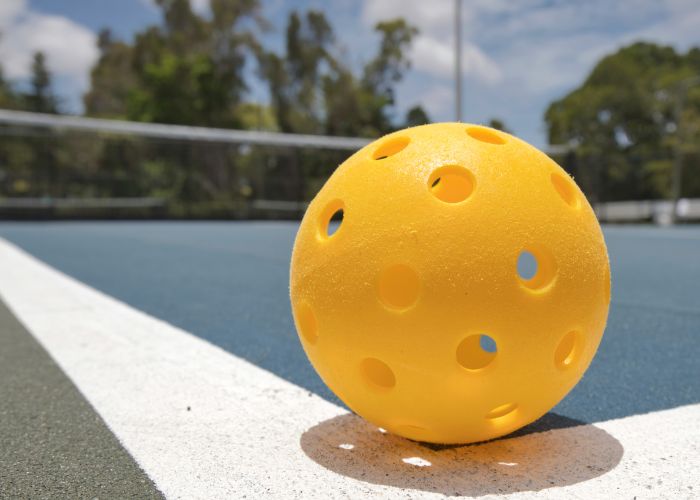 The holes for pickleball players come in the balls, which are small and plastic, and are between 2.8 and 2.9 inches in diameter.